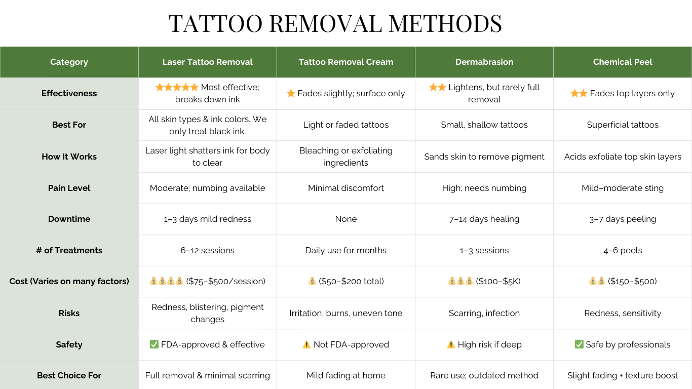 Notes: Complete removal cannot be guaranteed for every tattoo. Green, blue, yellow, or very dense black pigments may require additional sessions. Expectations are set during consultation.